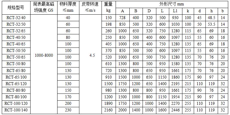 RCT(RCTB)系列永磁滾筒亦稱磁滑輪或幹式大(dà)快磁選機。其內(nèi)部采用高(gāo)性能強磁材料組成複合磁系,具有(yǒu)磁場(chǎng)強度高(gāo)、深度大(dà)、結構簡單、使用方便、不需要、維修、不消耗電(diàn)力,常年使用不退磁等特點。可(kě)用于水(shuǐ)泥、磁選、礦山(shān)、鋼鐵(tiě)、化工、耐火(huǒ)材料、垃圾處理(lǐ)等行(xíng)業的選鐵(tiě)。與DT-75型、AD-80型通(tōng)用固定式皮帶輸送機配套使用代替主動輪,也可(kě)與專用皮帶輸送機配套。